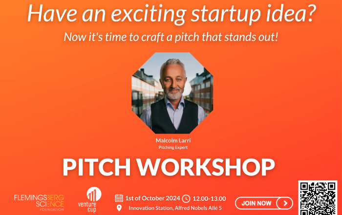 Tillsammans med Venture Cup, en av Sveriges ledande plattformar för startups och affärsidéer, välkomnar Flemingsberg Science Foundation dig till en workshop som kommer att hjälpa dig att skapa en övertygande och engagerande pitch för att ta din startup eller idé till nästa nivå.